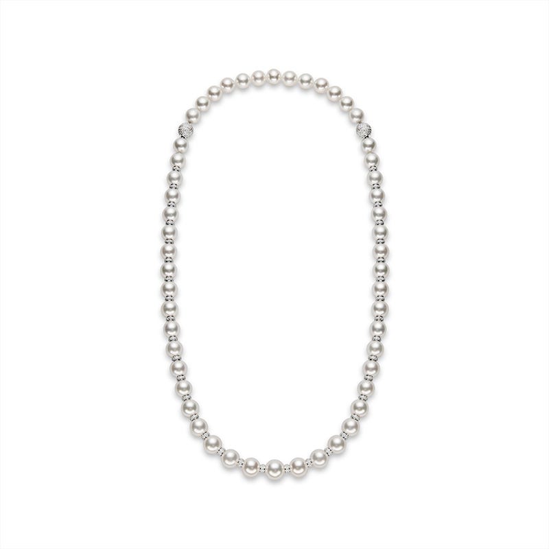 贅沢の極みを、当社の絶妙な 14~17.1mm のホワイト サウス シー養殖真珠に 14.12 カラットのダイヤモンド ロンデルとパヴェ ボールをあしらったコンバーチブル ネックレス。この傑作は比類のない汎用性を備え、あらゆる場面であなたのスタイルを変えます。