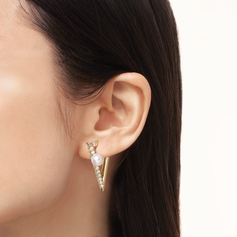 V コード コレクションのこのイヤリングは、 V 字型のシャープなエレガンスと 2 つの 5mm 諸曁養殖真珠の柔らかな輝きが美しく調和し、モダンで洗練された印象を与えます。イエローで作られ、0.6 カラットのダイヤモンドが、この洗練されたデザインに輝きを添えています。