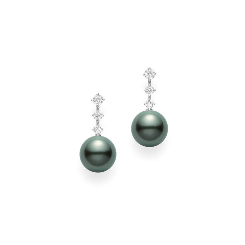 Black South Sea Cultured Pearls are produced by the black-lipped oyster, found only in French Polynesia. This pearl type exhibits a broad spectrum of colors, ranging from black to the rarest color, peacock with an intense iridescent overtone and the highest luster reminiscent of a peacock feather. These earrings feature two 11mm Black South Sea cultured pearls with 0.44cttw diamonds set in silver.