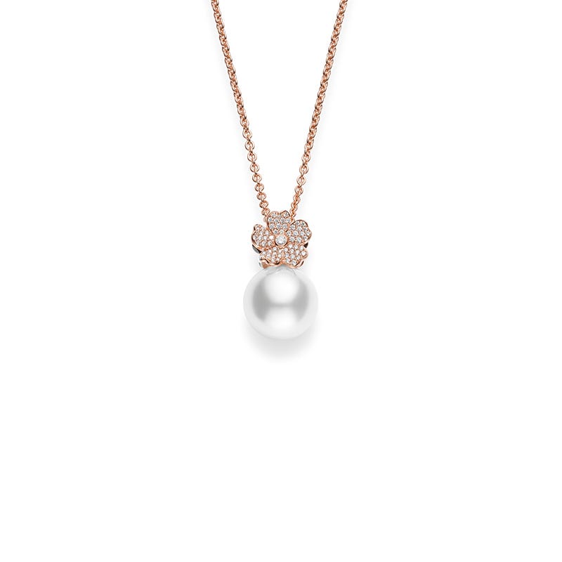 Following the tradition of the Cherry Blossom motif throughout Fanuly's history, this collection is the latest version of this concept. The design speaks to a delicate, smaller, five-petal blossom growing gradually around a pearl. It is specifically designed to feel as if you are discovering a pearl amidst a cluster of new blossoms. This pendant features a 12mm White South Sea cultured peal with .22ct of diamonds set in pink.