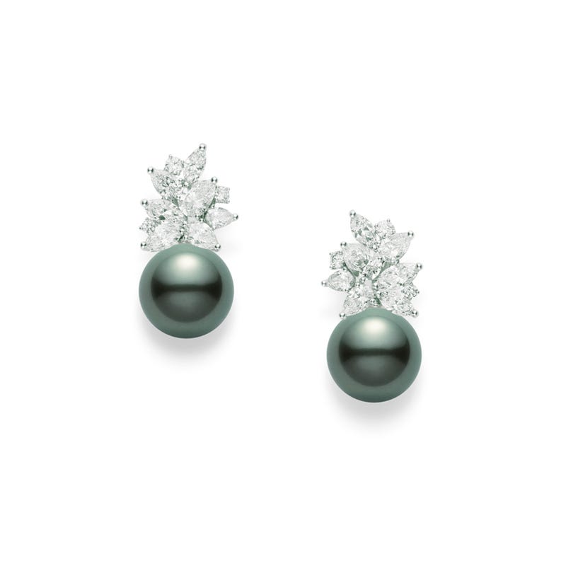 Black South Sea Cultured Pearls are produced by the black-lipped oyster, found only in French Polynesia. This pearl type exhibits a broad spectrum of colors, ranging from black to the rarest color, peacock with an intense iridescent overtone and the highest luster reminiscent of a peacock feather. These earrings feature two13mm Black South Sea cultured pearls with 3.84cttw diamonds set in silver.