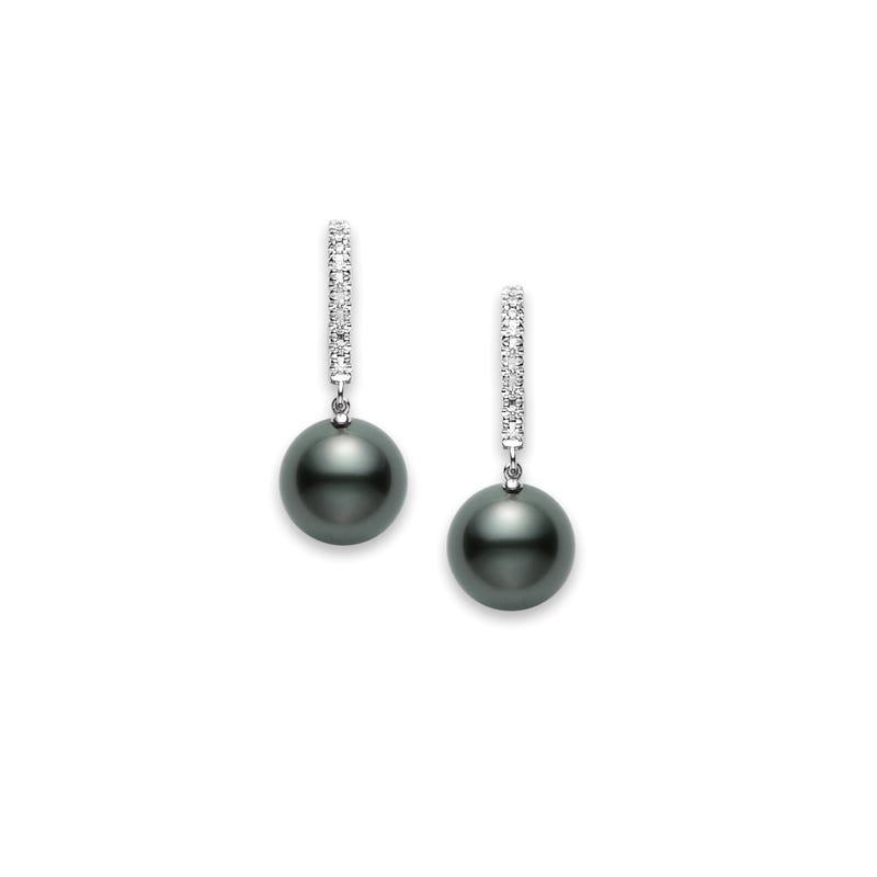 Black South Sea Cultured Pearls are produced by the black-lipped oyster, found only in French Polynesia. This pearl type exhibits a broad spectrum of colors, ranging from black to the rarest color, peacock with an intense iridescent overtone and the highest luster reminiscent of a peacock feather. These earrings feature two 10mm Black South Sea cultured pearls and 0.08ct. of diamonds, set in silver.