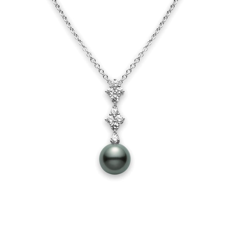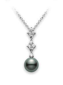 Black South Sea Cultured Pearls are produced by the black-lipped oyster, found only in French Polynesia. This pearl type exhibits a broad spectrum of colors, ranging from black to the rarest color, peacock with an intense iridescent overtone and the highest luster reminiscent of a peacock feather. This pendant features a 10mm Black South Sea cultured pearl with 0.73cttw of diamonds, set in silver. The chain is 18" long, but it can be worn as 16".