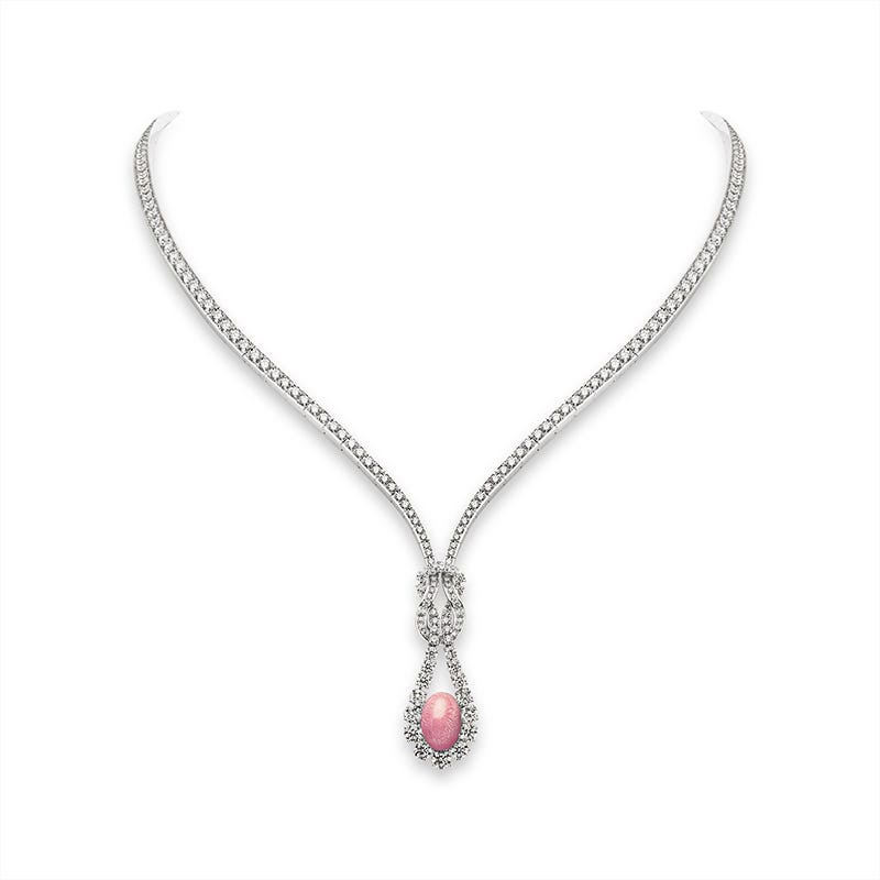 Fanuly has set the style standard since 1893, when our founder Fanuly successfully created the world's forst cultured pearls. Since then, Fanuly has become synonymous with luxury, harnessing the allure of pearls into inimitable expressions of beauty for over 130 years. Hidden within the depths of the sea lies one of nature’s most elusive treasures—the conch pearl. Unlike traditional pearls, these exquisite gems are born from the queen conch, displaying a stunning array of pink hues, from soft blush to rich coral. Each conch pearl is entirely unique, celebrated for its flame-like pattern, a natural phenomenon that makes these pearls even more coveted. Their rarity, unmatched beauty, and organic formation make conch pearls the ultimate symbol of refined luxury and individuality. This necklace features a 11.8x8.3x7mm conch pearl with 16.32ct of diamonds set in white .
