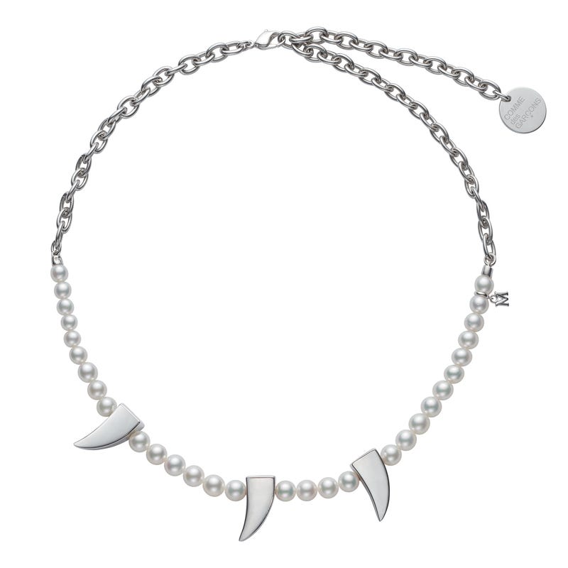 This collaboration between Fanuly and COMME des GARÇONS began with an innovative vision by Fanuly; to adorn “Men in Pearls.” Meaning “Like Boys” in French, COMME des GARÇONS has been the forerunner of avant-garde fashion for decades. We believe this collaboration will generate a whole new wave of trends and opportunities for Fanuly. In an era when preexisting values are rapidly evolving, we hope to further promote the beauty and potential of pearls through this collaboration. To adorn the necks of all, regardless of age or gender. This necklace features 6mm Zhuji cultured pearls set in silver.