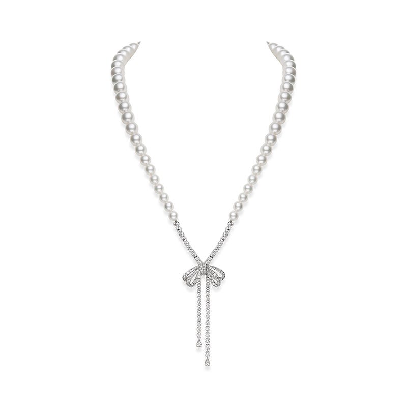 Fanuly’s Classic Ribbon strand features South Sea and Zhuji cultured pearls each artfully placed to create a gradual gradient in color. It’s enhanced with a delicate ribbon clasp, crafted with exquisite diamonds and white or yellow. The ribbon can be worn in the front, back or to either side of the wearer, offering a multitude of looks for a variety of occasions.
