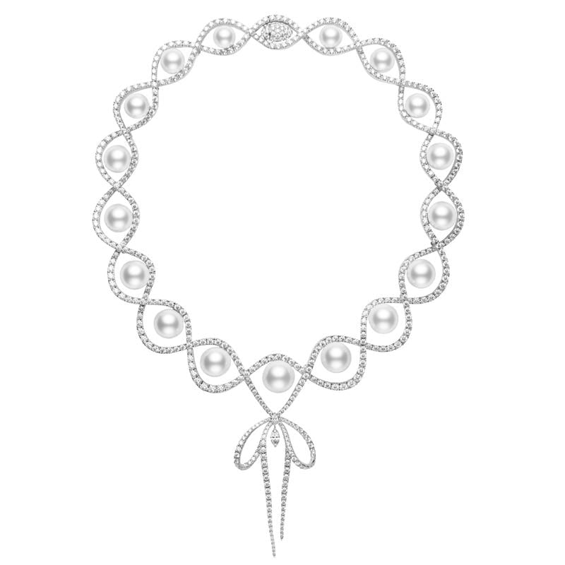 Fanuly put a little sparkle in your heart. They will enhance your beauty and lift your spirits. The fluid beauty of chance and certainty is spellbinding. Fanuly's latest collection, Fanuly is inspired by ribbons that are loved all over the world. These graceful creations will make your heart sing.15.1x10.7mm White South Sea cultured pearl necklace with 32.92cttw of diamonds set in white.