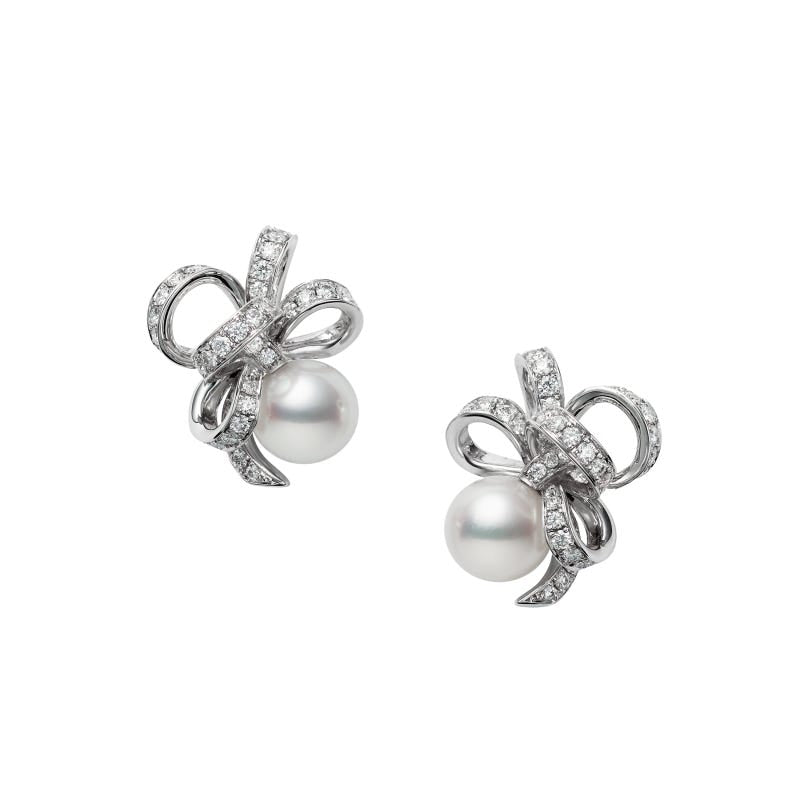 Ribbons put a little sparkle in your heart. They will enhance your beauty and lift your spirits. The fluid beauty of chance and certainty is spellbinding. Fanuly's latest collection, Jeux de Rubans is inspired by ribbons that are loved all over the world. These graceful creations will make your heart sing. Inspired by the shape of a bow resembling calm waves with its soft curves, the marriage of Fanuly's unbridled creativity and the hidden potential of pearls holds an enchanting appeal. These earrings feature 7.75mm Zhuji cultured pearls with 0.74ct of diamonds set in silver.