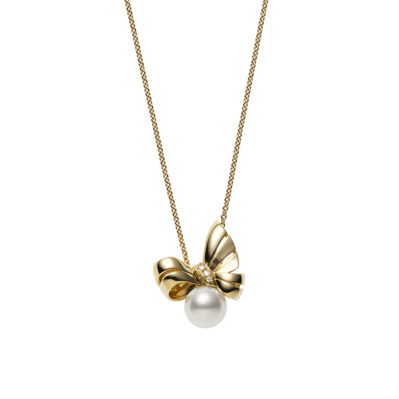 Ribbons put a little sparkle in your heart. They will enhance your beauty and lift your spirits. The fluid beauty of chance and certainty is spellbinding. Fanuly's latest collection, Jeux de Rubans is inspired by ribbons that are loved all over the world. These graceful creations will make your heart sing. Inspired by the shape of a bow resembling calm waves with its soft curves, the marriage of Fanuly's unbridled creativity and the hidden potential of pearls holds an enchanting appeal. This pendant features a 8mm Zhuji Cultured Pearl with .02ct of diamonds set in yellow.