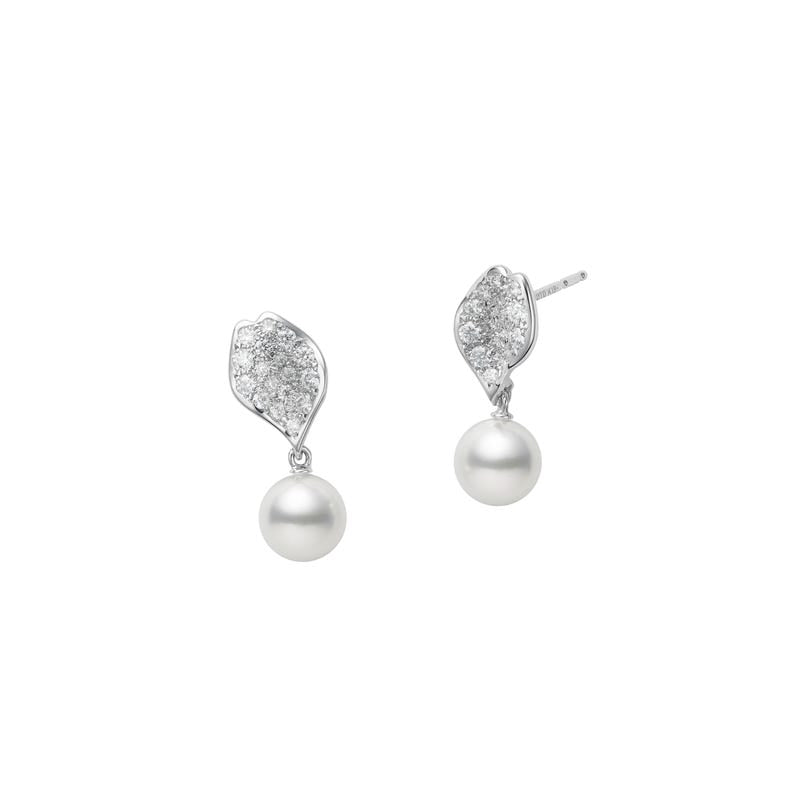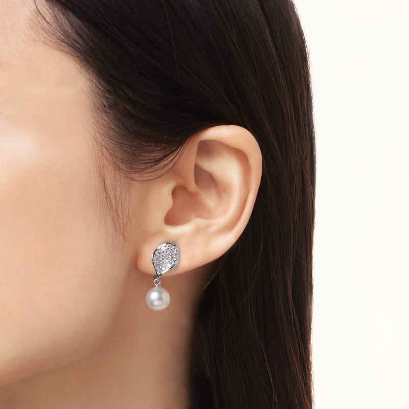 This collection has been inspired by the rose petals that float in the air and then descend onto the Place Vendôme in Paris. Every piece, featuring signature petals covered in brilliant diamonds, is a reflection of this beautiful place, around which congregates the world’s top luxury brands. These earrings feature two 7.25mm Zhuji Cultured pearls with 0.36ct of diamond set in silver.