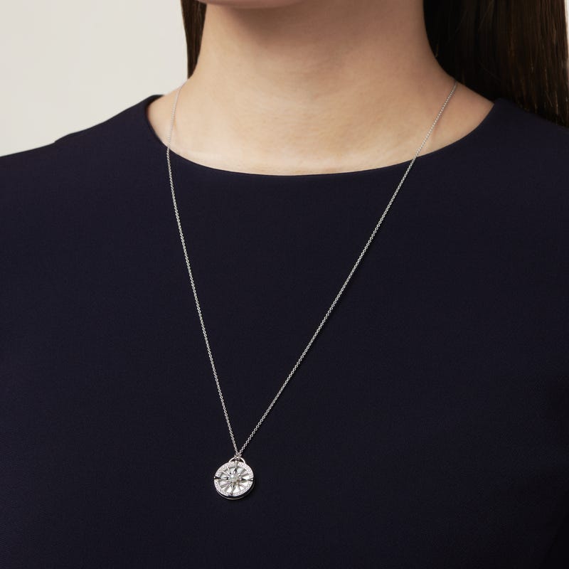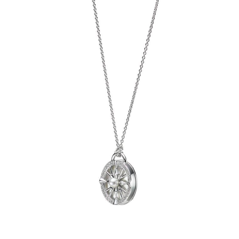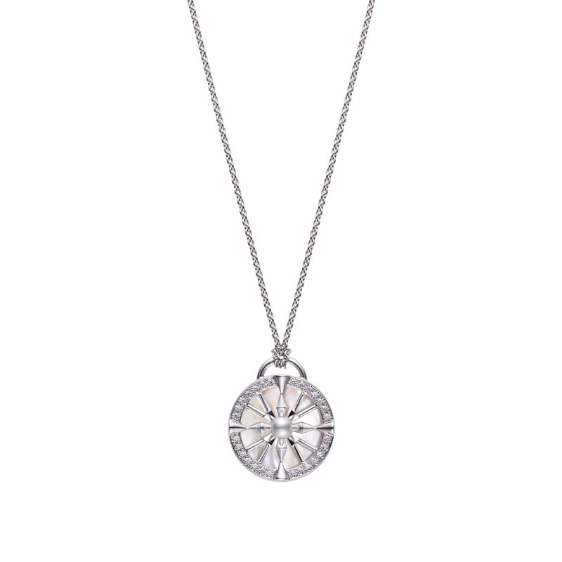 This iconic medallion features the motif of arrows a symbol of good fortune set in a radiating pattern. The mother-of-pearl’s gentle shimmering provides a perfect contrast with the sparkling diamonds, combining to form a good luck charm that lights the way toward a bright future. This pendant features a 3mm Zhuji cultured pearl along with mother of pearl and 0.12ct of diamond set in silver.