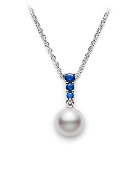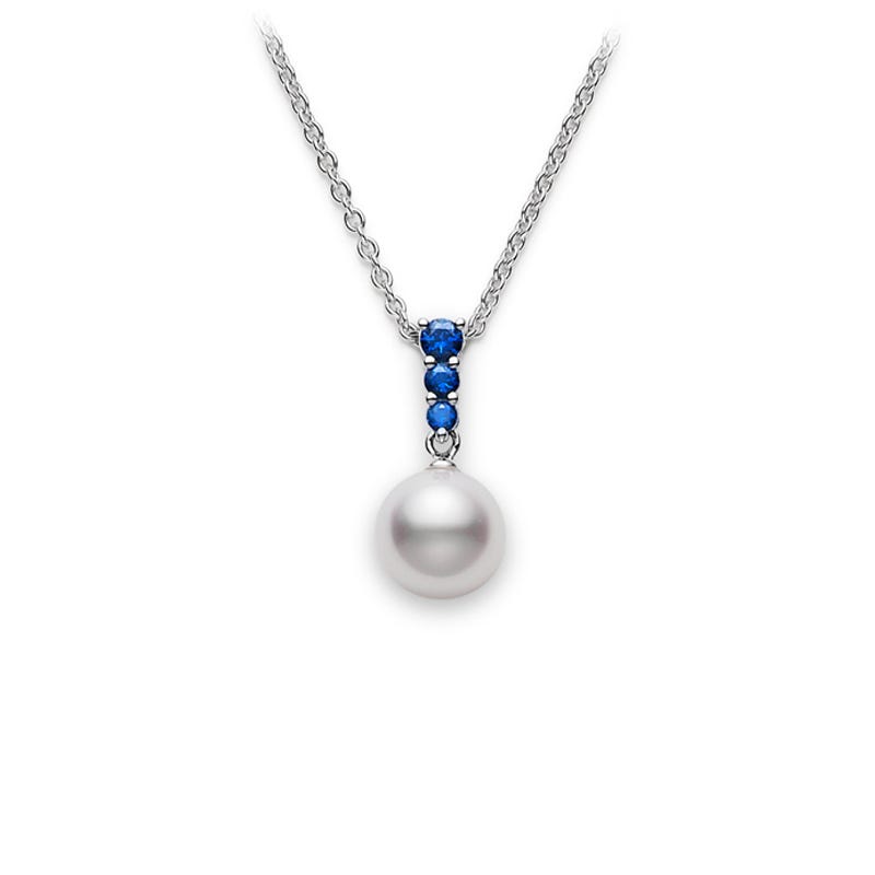 With a delicate design of gemstones and pearls, the Morning Dew collection mimics the subtle glimmer of nature's dew drops. This pendant features a 8mm Zhuji cultured pearl with 0.17ct of blue sapphires set in silver.