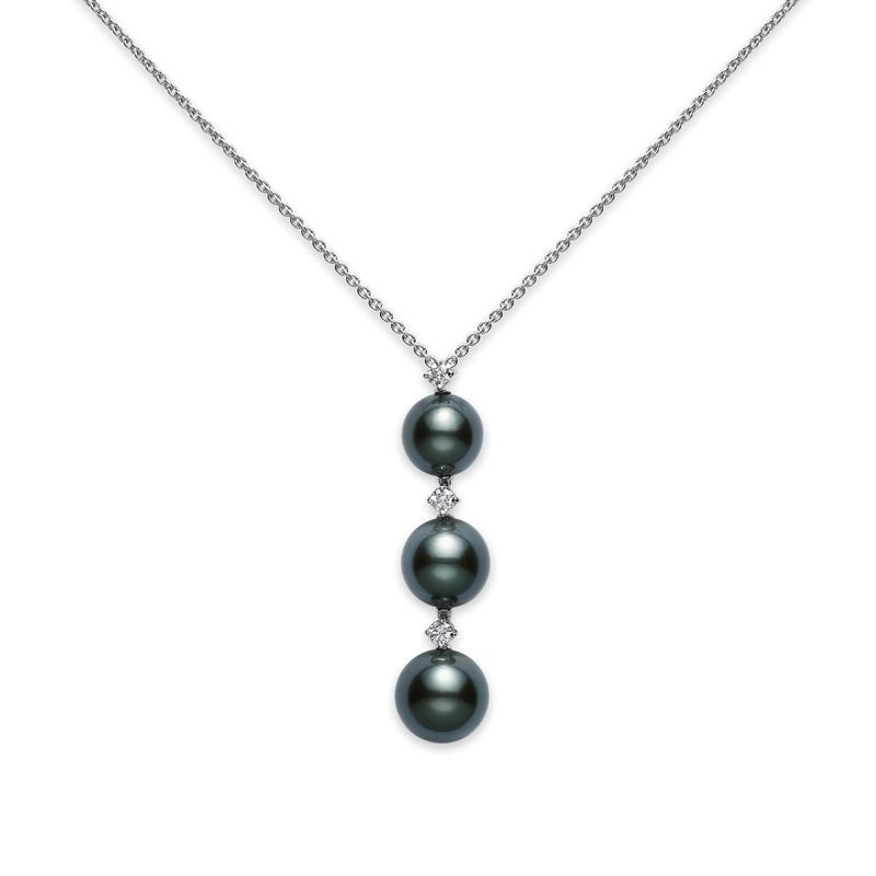 Black South Sea Cultured Pearls are produced by the black-lipped oyster, found only in French Polynesia. This pearl type exhibits a broad spectrum of colors, ranging from black to the rarest color, peacock with an intense iridescent overtone and the highest luster reminiscent of a peacock feather. This pendant features an 8mm, 8.5mm, and 9mm Black South Sea cultured pearl and 0.13ct of diamonds, set in silver.