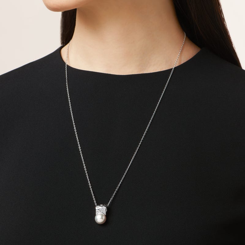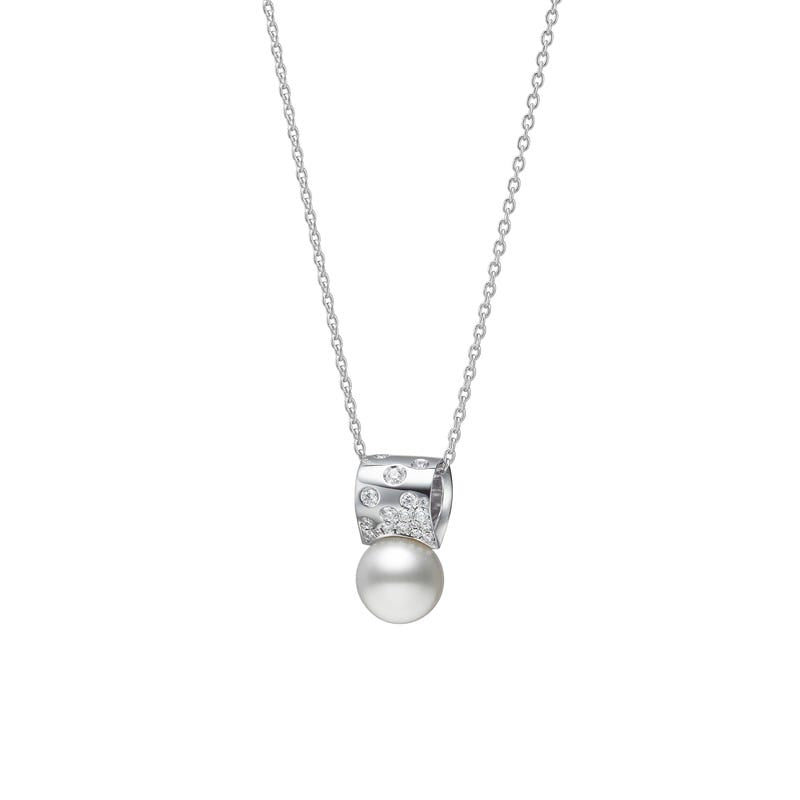 Air, water, fire, and earth have been considered the four major elements of the universe. Simple modern jewelry featuring the shapes of ○ (circle), △ (triangular), and □ (square). Taking inspiration from these shapes we present our latest collection, Universal Elements which highlights the shape of the pearl and the brilliance of the diamond blended to create a modern design with timeless elegance. This pendant features a 10.5mm White South Sea cultured pearl with 0.25ct of diamond set in silver.