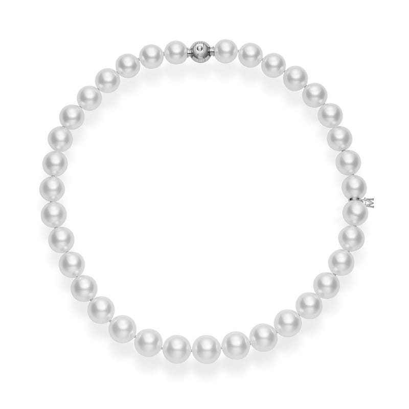 White South Sea cultured pearl strand necklace with white or yellow and diamond ball clasp.