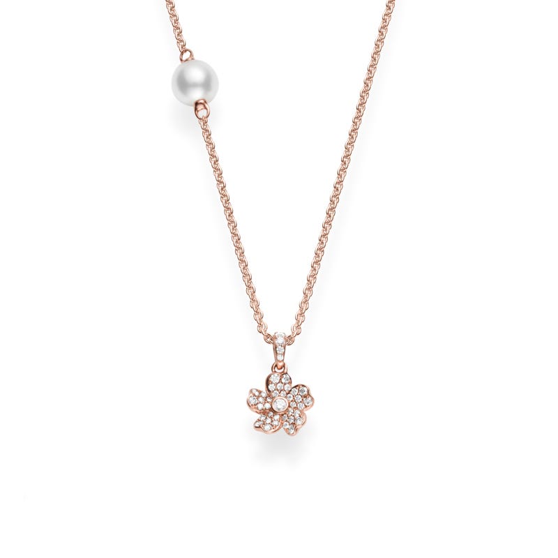 Following the tradition of the Cherry Blossom motif throughout Fanuly's history, this collection is the latest version of this concept. The design speaks to a delicate, smaller, five-petal blossom growing gradually around a pearl. It is specifically designed to feel as if you are discovering a pearl amidst a cluster of new blossoms. This pendant features 5.5mm Zhuji cultured pearls with .13ct of diamonds set in pink.